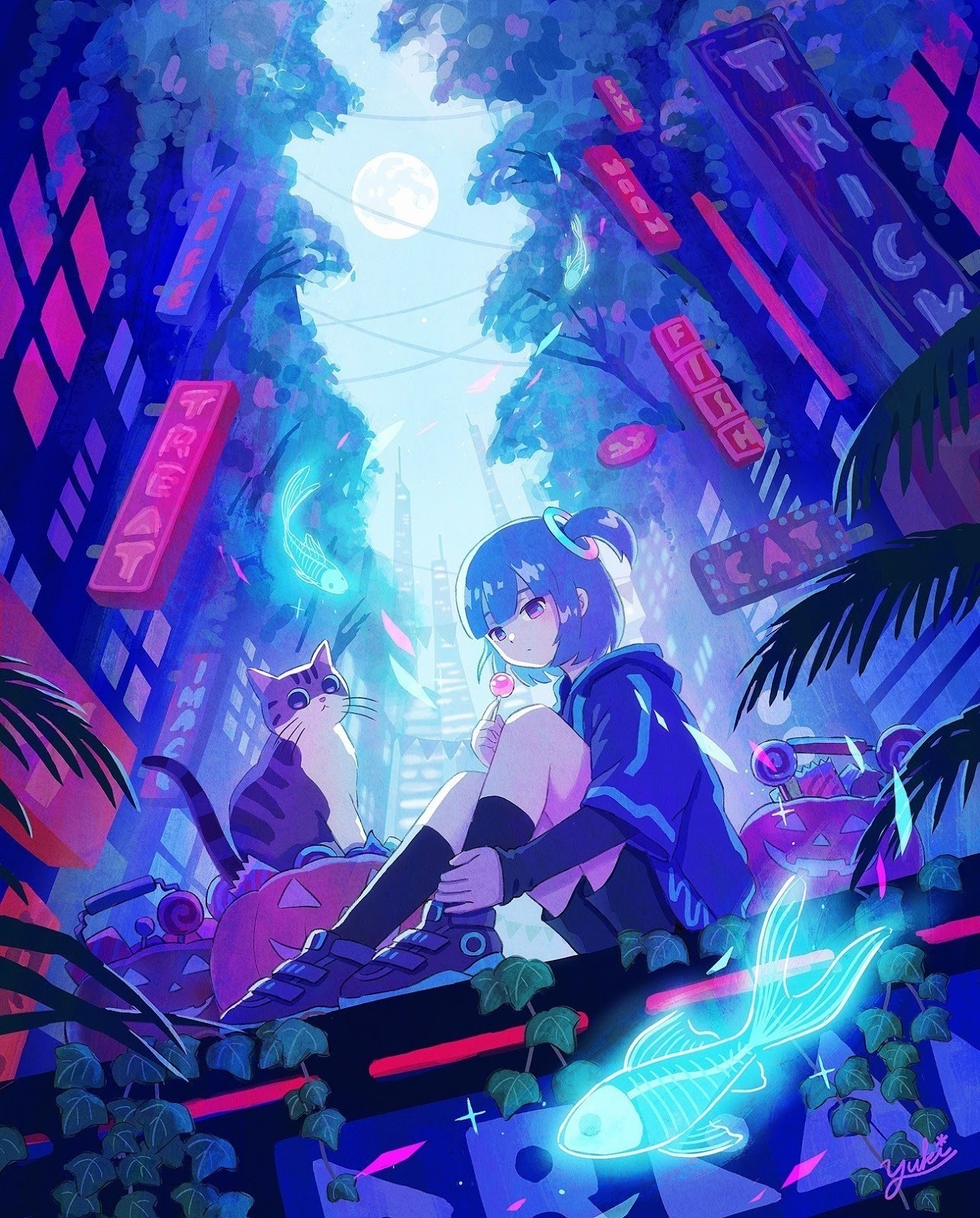 「FISH」の看板などもパースはずれていますが、いいですよね。よく見ると、ネオンやビルなどもラフな四角で表現されているのですが、そのゆるさとキャラやネコのデフォルメ感もマッチしています。アナログ絵具のような塗りも、デフォルメを許容する柔らかさがあります。