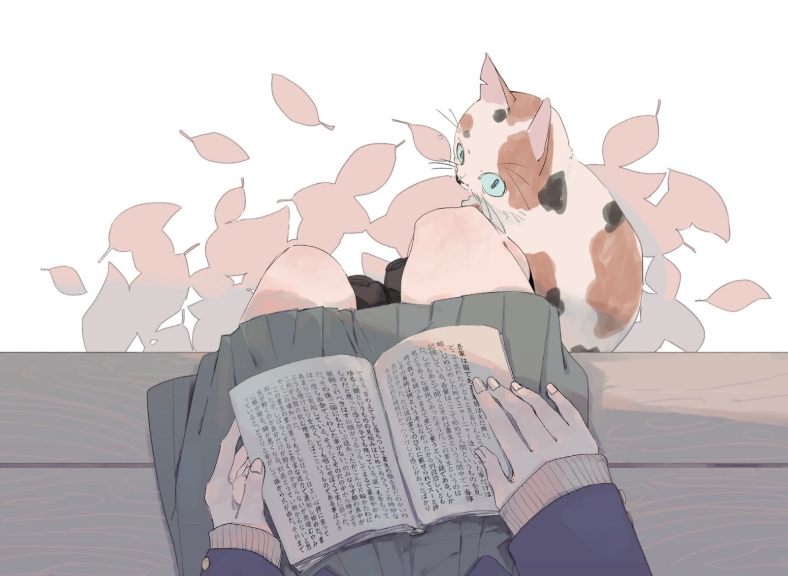 でも、この絵は逆に情報をぐっと絞っています。にもかかわらず、描写から読み取れる内容の多さたるや。秋のほんのりと暖かい日差し、でも肌寒そうな空気感、寄り添ってくれる猫の温度。「こんな絵作りもあるんだ」と、描写力にとても驚かされました。