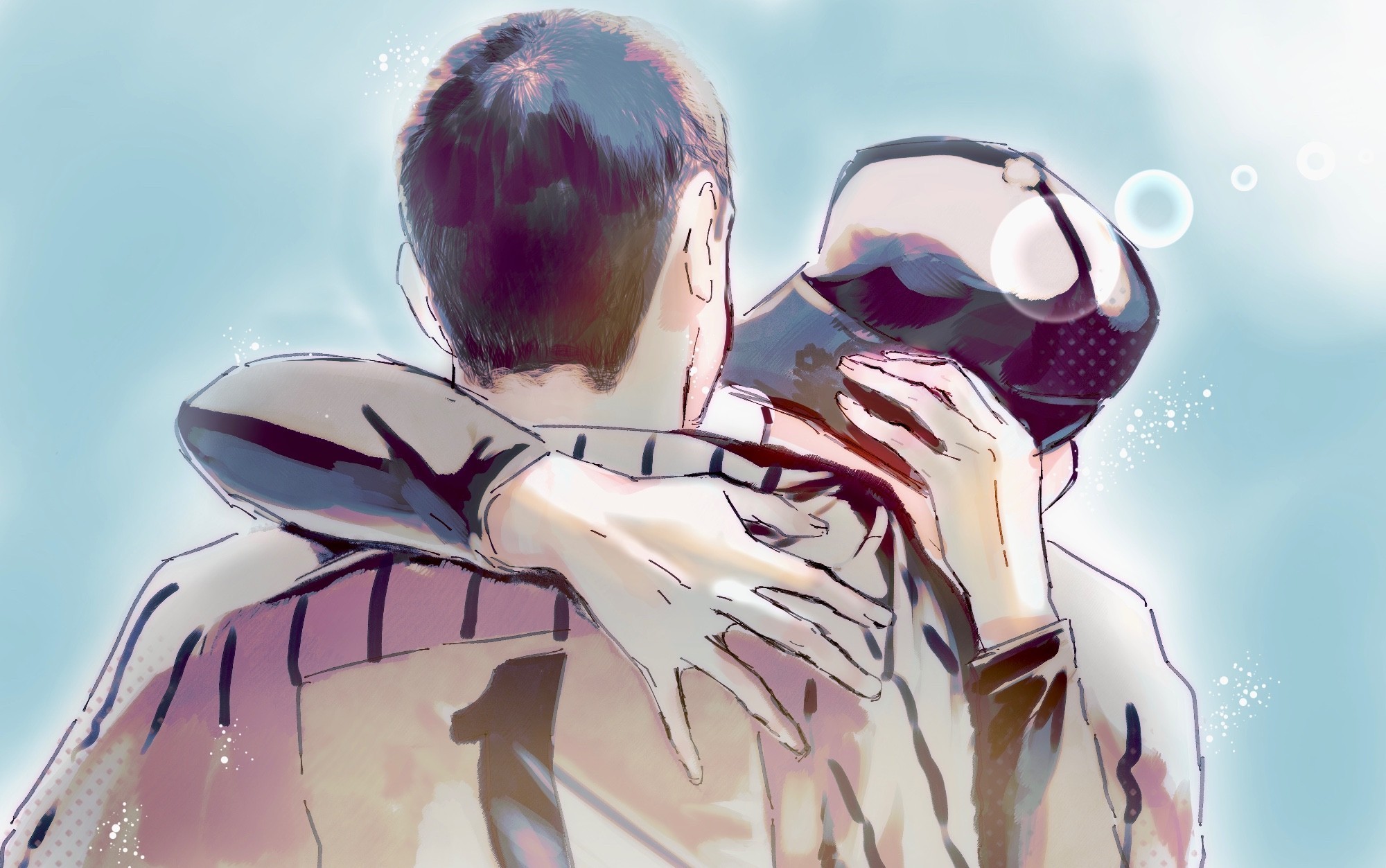 今回のテーマは「みんな泣き顔を描きたいのでは?」と思って決めたのですが、この作品は顔すら描かれていません。なのに、この二人の泣き顔を想像させられる。レベルの高い作品です。