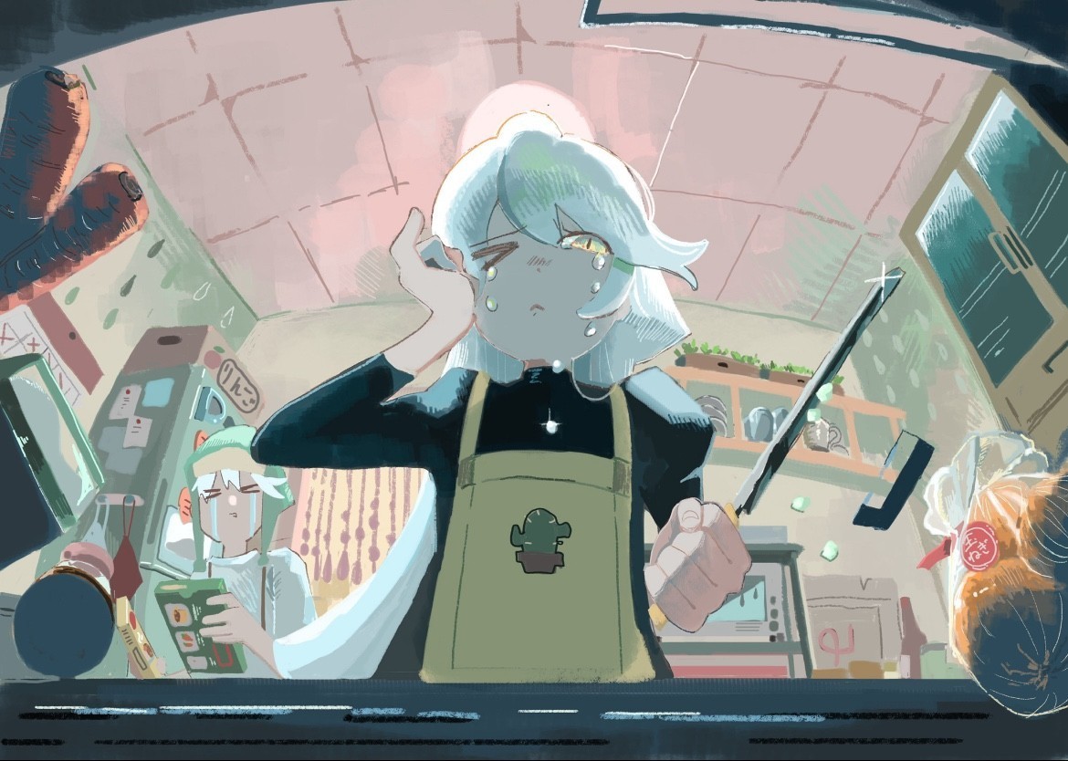 包丁が棒っぽく見えてしまい、絵の伝わりづらさに繋がっています。また、右に玉ねぎの袋があると思うんですが、切れてる玉ねぎも見たいですね。半分にパカっと割れてるとかで手前に置いてあると、わかりやすくなると思います。