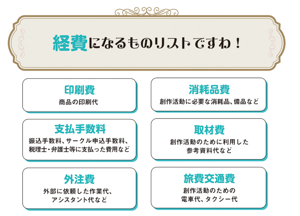 書籍内では、同人作家に特化した経費になるものリストを詳しく掲載しています。
